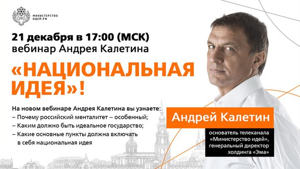 21 декабря в 17:00 (МСК) – новый вебинар Андрея Калетина «Национальная идея»! Государство без идеи – всё равно, что человек без цели. У страны обязательно должна быть национальная идея, которая заключается в духовности. Ведь материальные вопросы когда-нибудь остаются на втором плане, и приходит нечто большее. Нужно предпринять конкретные усилия, для того, чтобы национальная идея России наполнилась энергетическим потенциалом. Это особенно важно, ведь российский народ – народ душ... Фотогалерея: