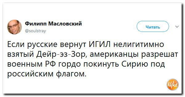 [club26072026| Подпишись на группу, пригласи друзей]✔ Сирия полностью освобождена от ИГ*, заявили в Генштабе Сирия полностью освобождена от террористов "Исламского государства"*, объявил начальник Генштаба генерал армии Валерий Герасимов. По его словам, войска генерала Сухела и 5-го добровольческого штурмового корпуса разгромили остатки боевиков в провинции Дейр-эз-Зор. После освобождения населенных пунктов Салихия, Эль-Хрейта, Эль-Катья и Мусалаха они соединились с правител... Фотогалерея: