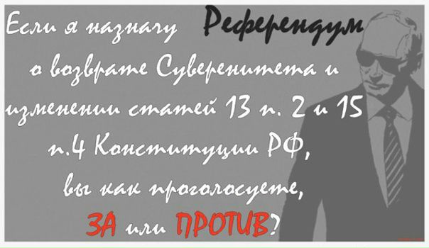 #Нод#опрос Порой слышим такой вопрос: "Когда уже референдум? Почему Путин его не объявит?" Допустим, завтра Президент объявил о референдуме. Сколько людей поймут, о чём речь и проголосуют "ЗА"? Проверим? Максимальный репост для максимального охвата. Что именно поменять, смотрите ниже или по ссылке: Вопросы, выносимые на референдум: 1. отменить положение о приоритете общепризнанных принципов и норм международного права путем внесения изменений в ч.4 ст.15 Конституции Росс... Фотогалерея: